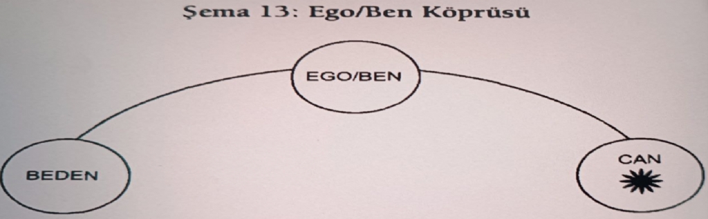 Merter'in kitabında ego; insanın sonsuz olan ruhsal boyutu ile sınırlı olan fiziksel dünyası arasındaki arayüzdür. Kitaptaki şemada beden ve can arasındaki köprüdür ego; ruh-beden düalizminin portalıdır. Yani dünya ve ahiret arasındaki köprünün ontolojik zeminidir. Bir tarafa eğilecek olursak köprü yıkılır. Tıpkı dünya için ahiretten vazgeçmenin yahut ahiret için dünyadan vazgeçmenin insan olmanın doğasını bozması gibi...